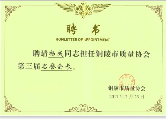 2017年2月末市質量協會聘請董事長楊成先生,擔任銅陵市質量協會第三屆名譽會